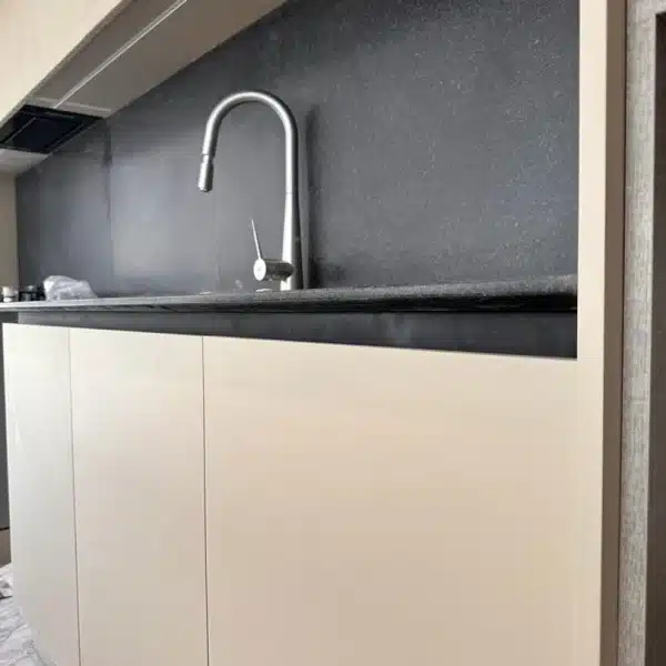 پروژه آشپزخانه نئوکلاسیک با کابینت‌های ام‌دی‌اف ۲۵ میل، صفحه کوارتز و یراق‌آلات Bloom
